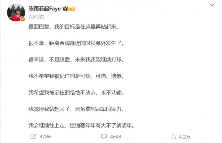 本次世锦赛半决赛,陈雨菲淘汰世界第一安洗莹晋级决赛,但在半决赛中崴脚受伤。决赛过后,陈雨菲发文总结了本次世锦赛。
